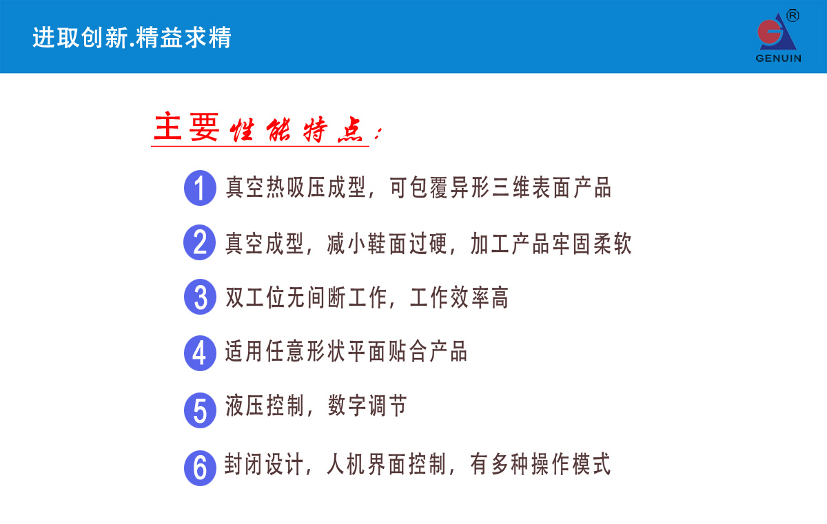 GN-680D型真空熱轉印機采用真空熱壓原理,針對運動鞋面熱壓成型加工,突破傳統平板熱壓工藝的局限,減少平板熱壓膠水擠壓導致鞋面過硬的缺點。加工出來的鞋面產品平整、牢固、柔軟,為客戶提供運動鞋面產品更合理、更人性化的生產方式及工藝。