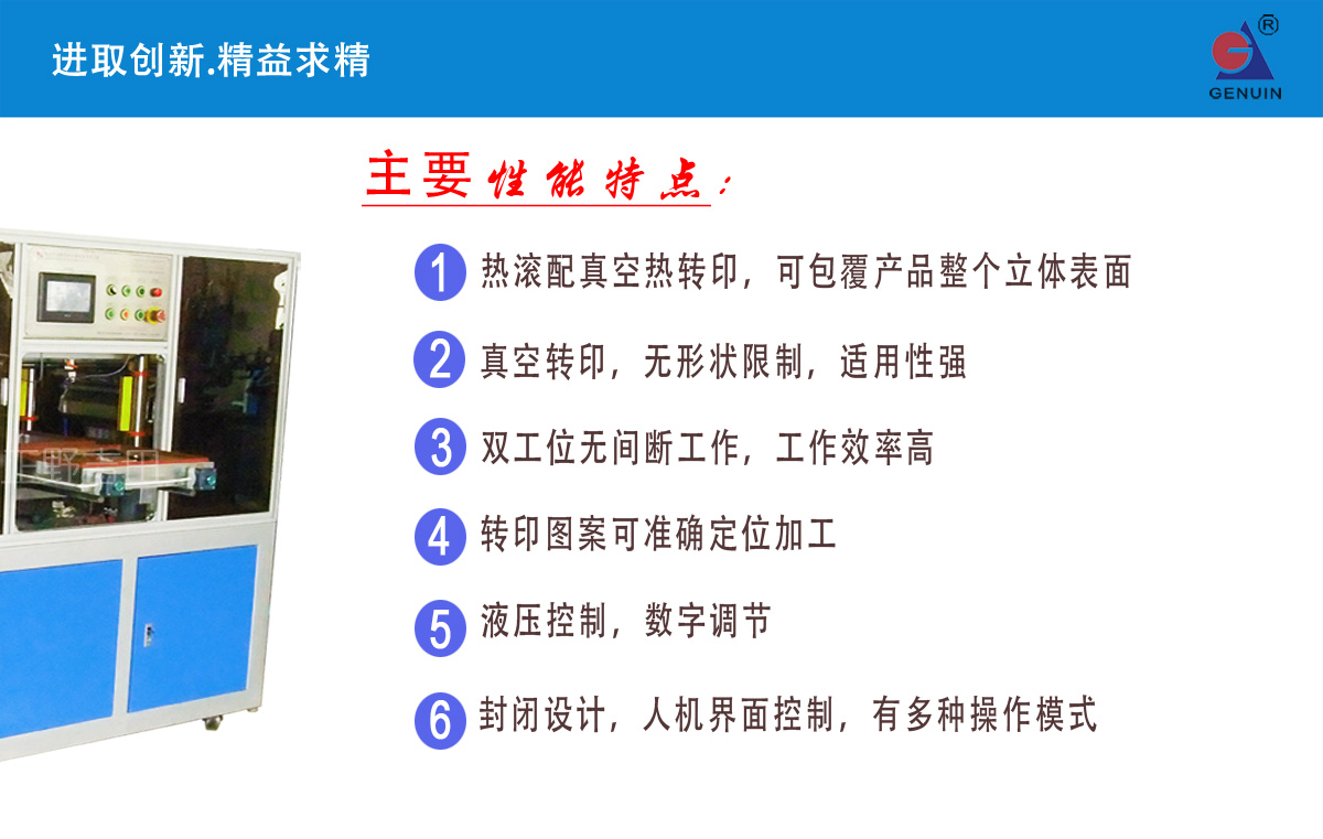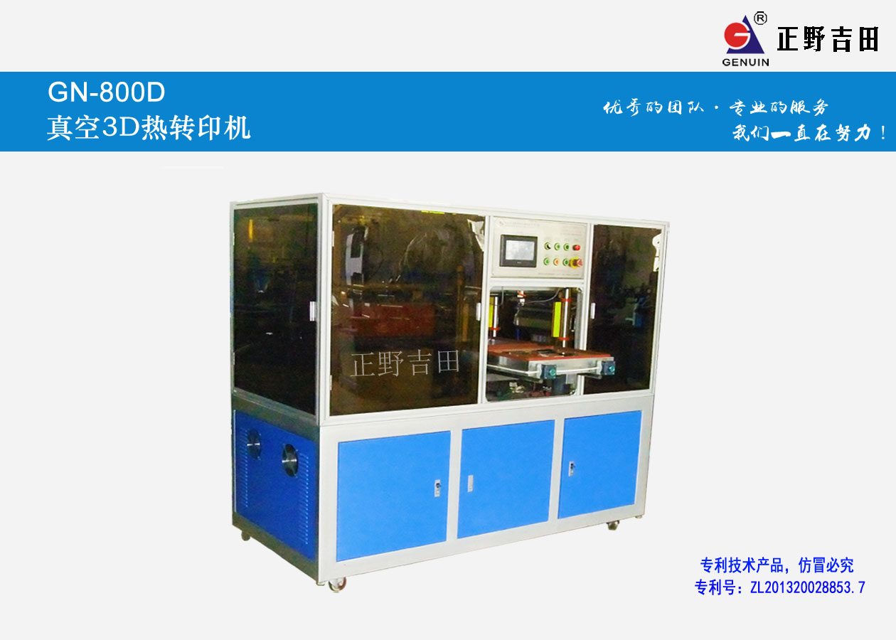 GN-800D型全彩3D真空熱轉印機采用熱滾真空原理,針對產品整個3D表面或不規則產品表面全彩熱轉印加工一次性成型。全密封結構設計,外形美觀。為客戶提供3D產品更合理、更高效的生產方式及工藝,從而解決以往3D產品及異型產品熱轉印加工的難題,降低生產成本提高產品的檔次。
