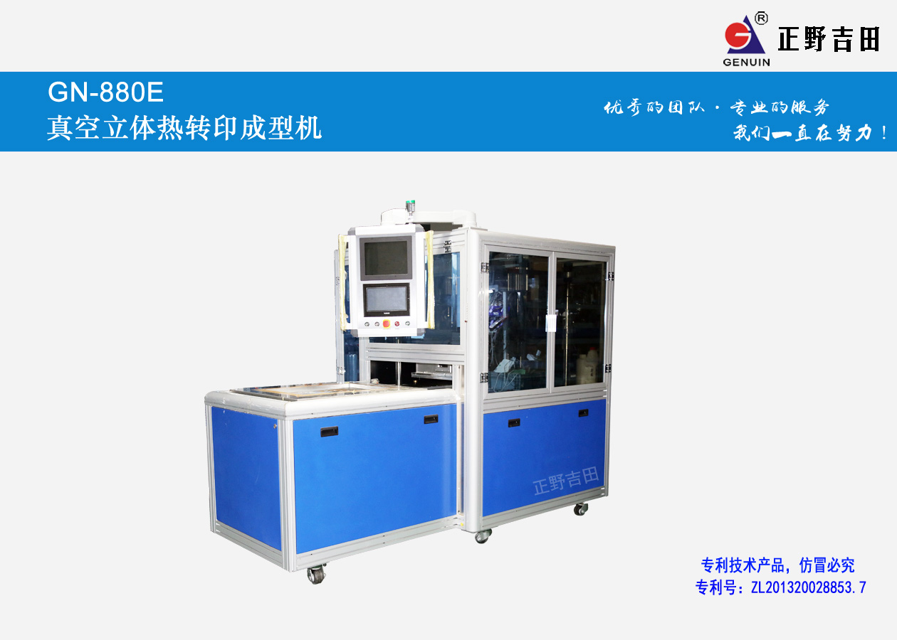 GN-800E數字仿形真空3D熱轉印機采用自動仿形熱滾加真空包裹轉印原理,針對大型不規則產品整個3D表面全彩熱轉印加工一次性成型。特別針對有凹角、尖角、內角等無法真空包裹轉印的產品設計二次加壓功能,徹底解決無法轉印的難題。全密封結構設計,外形美觀。為客戶提供大型不規則3D產品印刷更合理、更高效的生產方式及工藝,從而解決以往大型不規則3D產品熱轉印加工的難題,降低生產成本提高產品的檔次。