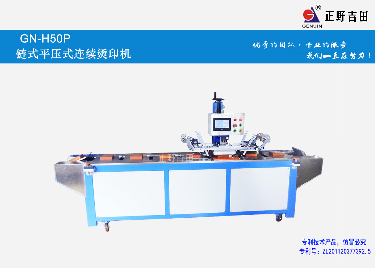 GN-H50P型鏈式平壓連續燙金機是目前市場上性價比的一種機型,該機采用鏈條連續輸送平壓燙印工作方式,配合先進光電自動對位系統及無級變頻調速進給系統,可實現連續不斷地自動對位燙印工作,適用于燙金及熱轉印兩種功能,手動上料后自動燙印及自動卸料實現自動化生產,大大提高生產效率,提升燙印效果及質量。