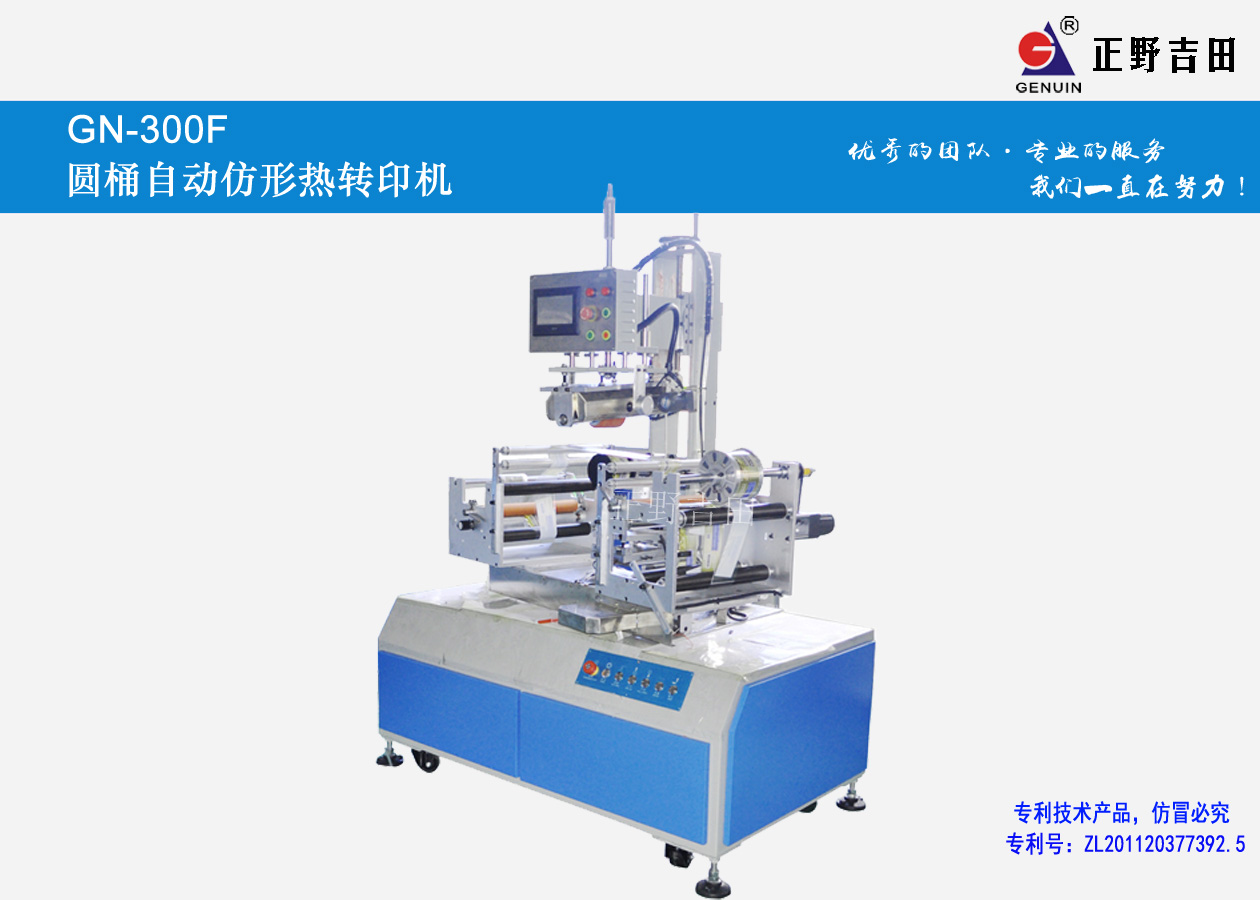 GN-300F圓桶自動仿形熱轉(zhuǎn)印機(jī)針對大件圓桶產(chǎn)品轉(zhuǎn)印設(shè)計(jì),采用數(shù)字控制,自動搖擺仿形燙印,適用于大中型圓桶產(chǎn)品表面熱轉(zhuǎn)印。