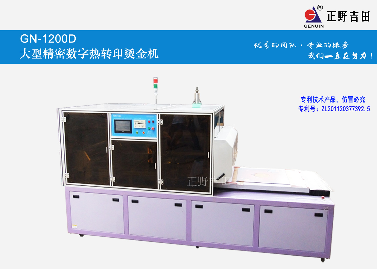 GN-1200D大型精密熱轉印燙金機針對大型平面印件自動燙印,具有自動邊緣糾偏、熱轉印膜自動定位、多段式加熱方式、自動完成燙印等等功能,合理的工藝設計,使得本機燙印效果更無暇,操作工藝更簡捷合理,是大型平面印件印刷提高生產效率和質量的理想設備。