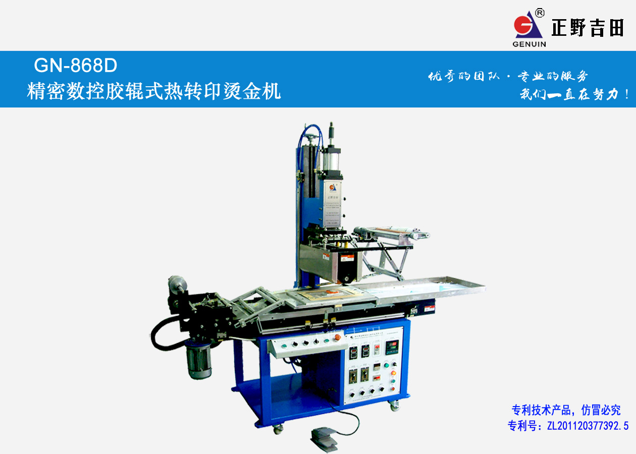 GN-868D精密膠輥式熱轉(zhuǎn)印燙金機(jī)是目前市場上性能要求的一種機(jī)型,采用工作臺電動絲桿移動方式,工作臺運(yùn)行更加平穩(wěn),位置起停準(zhǔn)確,可對高要求的工件進(jìn)行操作,大面積燙印設(shè)計(jì),適用范圍更廣的產(chǎn)品,具有快速、方便、易于操作、燙印效果佳等功能,可調(diào)整速度及弧度、定時、定點(diǎn)等操作,對各種加工件有著的效果,加工出來的物件平整、光潔、無拉花、粗粒之效果。